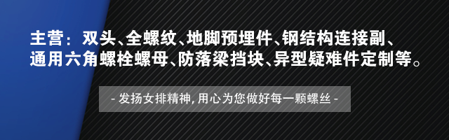 主營高強度產品達千余種,雙頭、全螺紋、地腳預埋件、鋼結構連接副、通用六角螺栓螺母、防落梁擋塊、異型疑難件定制等。